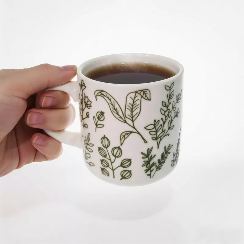 1. Tento hrnček sa vyznačuje jednoduchou a prirodzenou zelenou botanickou potlačou ako vizuálnym stredobodom: